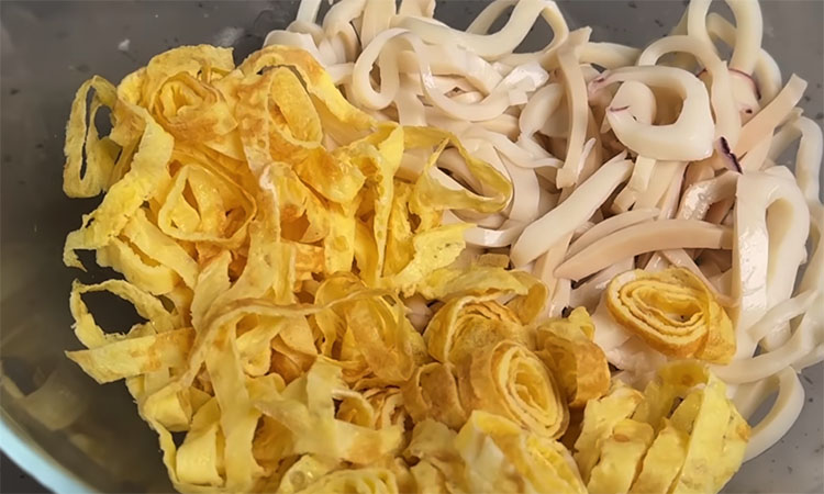 Начните с приготовления кальмаров, опустив их в кипящую подсоленную воду ровно на одну минуту. Сразу откиньте морепродукты на дуршлаг и обдайте холодной водой, после чего нарежьте их тонкими полосками или кольцами. Для яичных блинчиков взболтайте яйца со щепоткой соли и поджарьте на смазанной маслом сковороде два тонких блина.