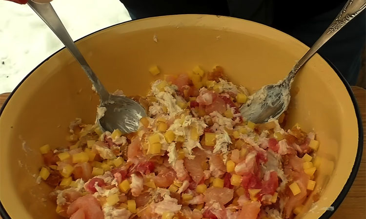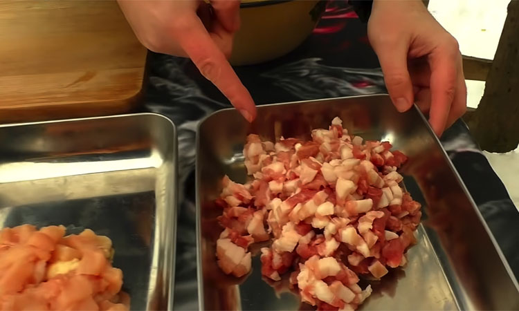 Начните подготовку с тщательного измельчения всех основных компонентов. Свиной подчеревок, куриное филе и очищенный картофель нарежьте очень мелким кубиком, чтобы начинка получилась равномерной и сочной. Лук нашинкуйте мелко и обязательно обжарьте на вытопленном свином сале до появления золотистого карамельного оттенка, так как именно этот шаг дает колбасе правильный аромат. Сырое сало и чеснок мелко порубите ножом или пропустите через мясорубку, после чего соедините все продукты в одной глубокой емкости.