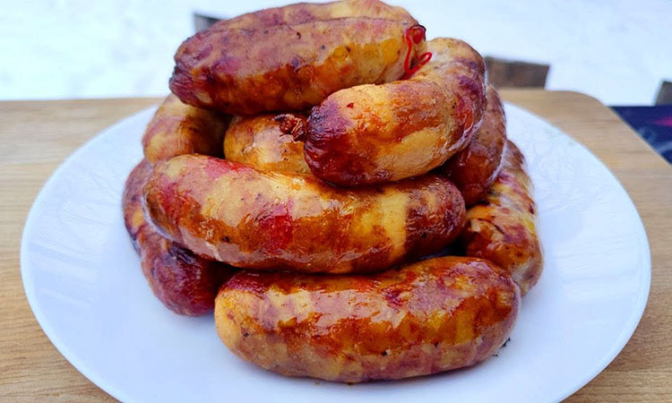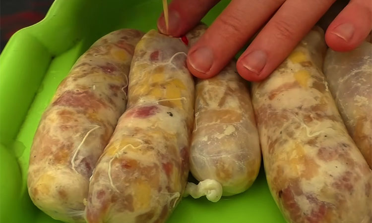 Каждую заготовку обязательно проколите зубочисткой в нескольких местах для выхода лишнего воздуха, чтобы оболочка не лопнула при нагревании. Выложите колбасу на решетку мангала или противень и запекайте на умеренном огне около полутора часов.