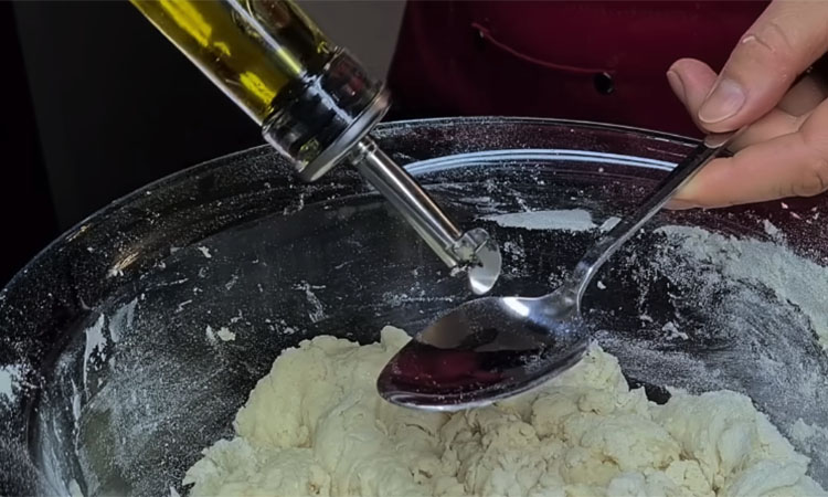 Смажьте руки маслом, соберите тесто в комок и оставьте в теплом месте на полтора часа, пока оно не увеличится в три раза. Смажьте стол маслом, отщипывайте кусочки теста размером с яйцо, растягивайте их пальцами и выкладывайте в центр щедрую порцию холодной начинки.