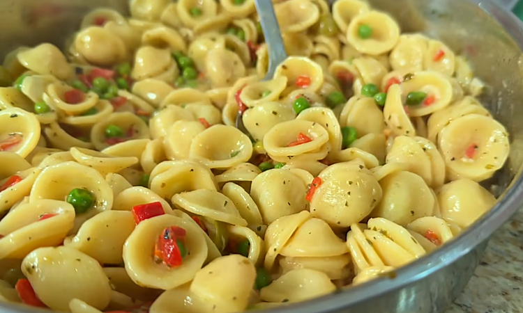Когда чеснок начнет румяниться, добавьте к нему мелко порезанные анчоусы и разотрите их лопаткой в пасту прямо в масле. Обязательно наберите стакан воды из кастрюли с макаронами перед тем, как их сливать, и не промывайте готовую пасту под краном. Нарежьте запеченный перец и оливки кусочками, отправьте их на сковороду вместе с замороженным горошком и сушеным орегано.