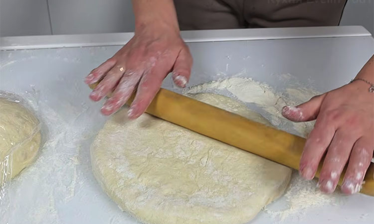 Аккуратно расплющите пирог руками или скалкой в тонкий круг, сделайте небольшое отверстие в центре для выхода пара.