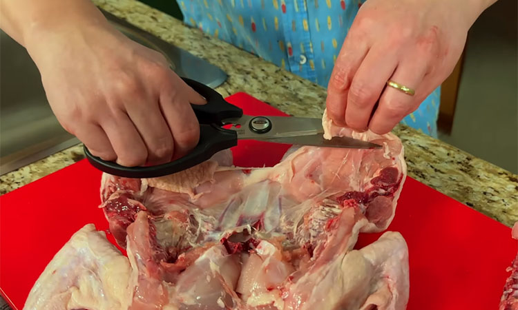 Для начала подготовьте курицу. С помощью кухонных ножниц вырежьте хребет — режьте вдоль кости с обеих сторон. Хребет не выбрасывайте, он отлично подойдет для наваристого бульона. Переверните курицу грудкой вверх, немного надрежьте хрящ посередине изнутри и сильно придавите ладонью, чтобы тушка стала плоской. Обязательно обсушите мясо бумажными полотенцами, чтобы специи лучше легли, а кожа стала хрустящей.