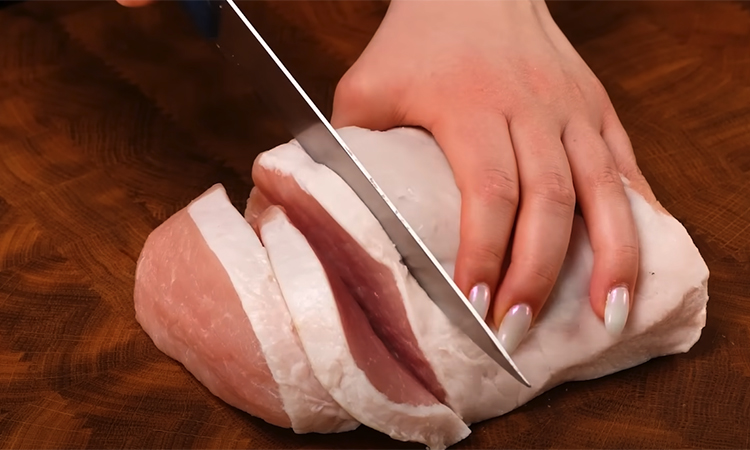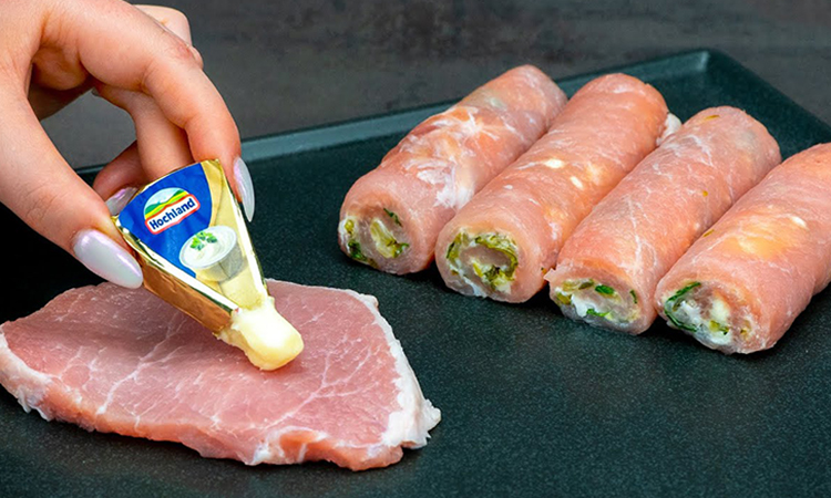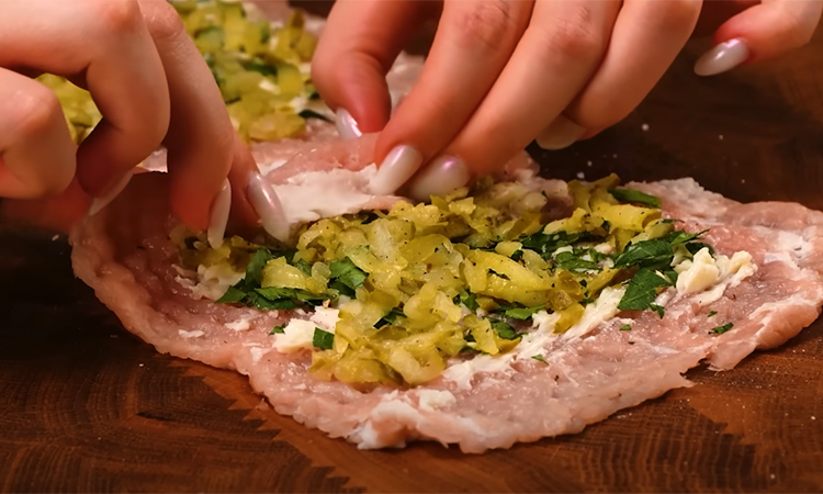 3. Формирование рулетов: Аккуратно сверните каждый кусочек свинины с начинкой в плотный рулетик, чтобы сыр и огурцы не вываливались. Рулетики должны держать форму, но не быть слишком тугими.