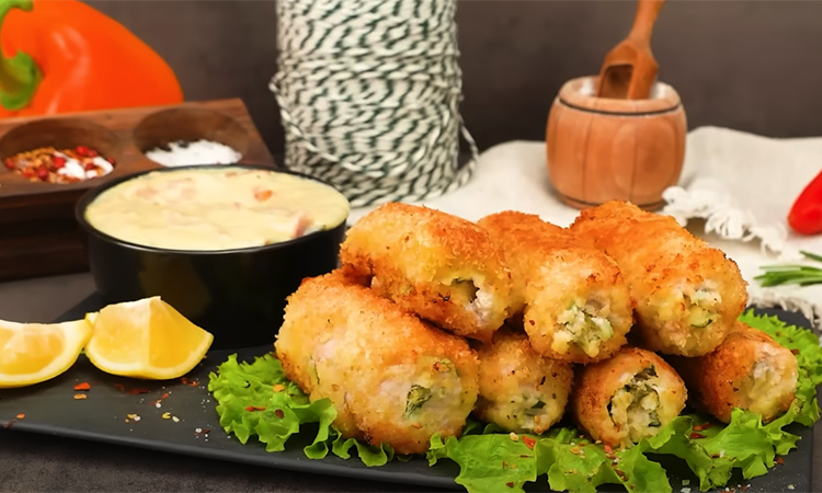5. Панировка: Каждый рулет сначала обмакните в яйце, затем равномерно обваляйте в муке. Снова окуните в яйцо и тщательно обваляйте в панировочных сухарях. Панировка должна полностью покрывать мясо, чтобы рулетики получились с хрустящей корочкой.