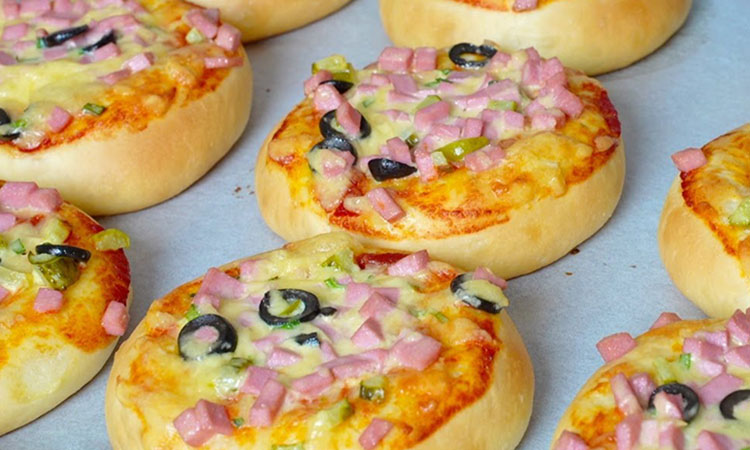 Смажьте центр каждой заготовки капелькой кетчупа (по желанию), а затем равномерно распределите подготовленную сочную начинку по всем девяти смаженкам. Сверху присыпьте тертым сыром и добавьте маслины или зелёный лук для красоты. Отправьте противень в разогретую до 180 градусов духовку и выпекайте около 20-25 минут, пока тесто не станет пышным и золотистым.