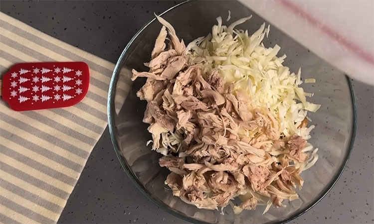 Если она жесткая, слегка помните ее руками с щепоткой соли, чтобы она стала мягче и пустила сок. Отправьте капусту к грибам и луку. Отварное куриное мясо (лучше брать бедра, они сочнее) отделите от костей и нарежьте средними кусочками или разберите на волокна. Кальмары очистите и отварите в кипящей воде ровно 1 минуту, после чего сразу промойте холодной водой — так они останутся нежными.