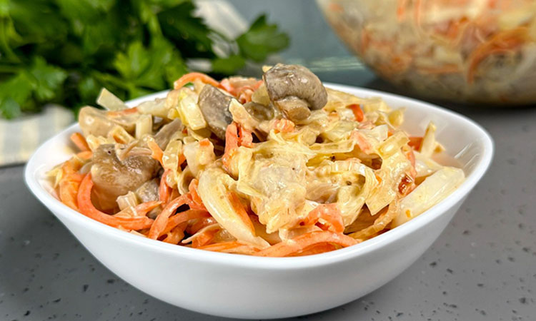На первый взгляд сочетание продуктов в этом салате кажется странным: ну как могут подружиться кальмары, жареные грибы и свежая капуста? Но стоит попробовать ложечку, и вы поймете — все здесь выверено до грамма. Салат получается невероятно сочным, ароматным и сытным, готовится он довольно быстро, особенно если заранее отварить курицу и кальмары.