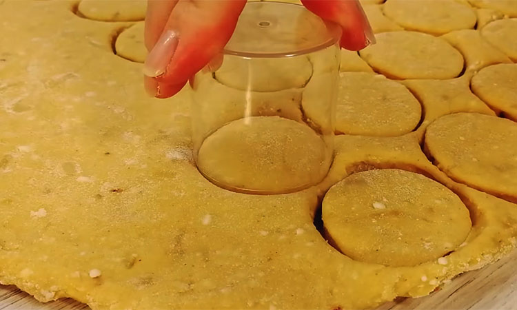 С помощью маленькой рюмочки, стаканчика или просто ножа вырежьте кружочки или небольшие квадратики. Обрезки теста снова соберите в комок, раскатайте и вырежьте оставшиеся фигурки, пока всё тесто не закончится. Разогрейте сковороду с небольшим количеством растительного масла. Выкладывайте творожные заготовки и обжаривайте их на огне чуть ниже среднего.