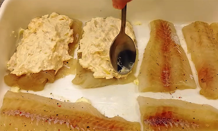 В миске соедините творожный сыр, две ложки майонеза и баночку икры минтая. Добавьте обжаренный лук и тертый твердый сыр. Все тщательно перемешайте до однородности. Солить эту смесь, скорее всего, не придется, так как икра и сыр уже содержат достаточно соли. Возьмите форму для запекания и щедро смажьте её дно и бортики сливочным маслом. Выложите кусочки промаринованного минтая в форму в один слой. Поверх каждого кусочка распределите подготовленную икорно-сырную массу.