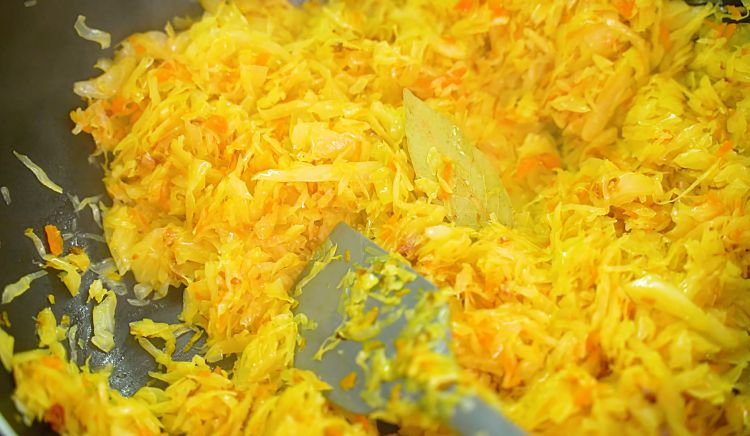 3. Пока тесто отдыхает, подготовьте начинку. Лук очистите и нарежьте полукольцами, морковь натрите на крупной терке, а капусту нашинкуйте тонкой соломкой. Разогрейте на сковороде растительное масло и обжарьте лук до золотистого цвета, чтобы он стал мягким и сладковатым. Добавьте морковь и капусту, перемешайте и жарьте примерно 10 минут, пока овощи слегка не уменьшатся в объеме. После этого накройте сковороду крышкой и тушите на медленном огне 20–25 минут, периодически помешивая. В середине процесса добавьте соль, черный перец и лавровый лист для аромата. Готовая начинка должна быть мягкой, слегка влажной, но не жидкой.