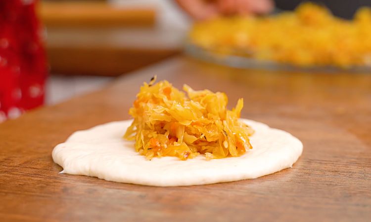 4. Достаньте тесто из холодильника и разделите его на равные кусочки — примерно 20 шариков. Каждый шарик раскатайте в небольшой круг толщиной около 0,5 см. На середину каждого круга выложите 1–2 столовые ложки начинки и аккуратно защипните края, формируя пирожок. Убедитесь, что края хорошо защипаны, чтобы начинка не вытекла при жарке.