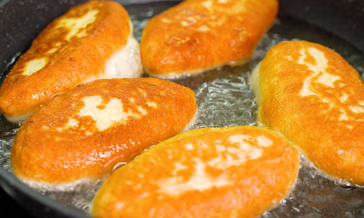 5. В глубокой сковороде или во фритюрнице разогрейте растительное масло — его должно быть достаточно, чтобы пирожки свободно плавали. Обжаривайте пирожки на среднем огне с обеих сторон до красивой золотистой корочки. При жарке на сковороде можно накрыть крышкой на 1–2 минуты, чтобы пирожки прожарились внутри. Готовые пирожки выкладывайте на бумажное полотенце, чтобы удалить лишнее масло.