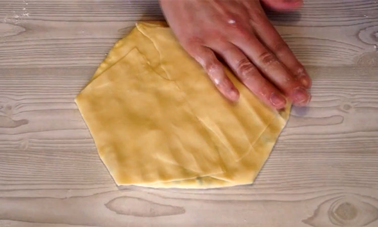 Поочередно загибайте противоположные сегменты к центру, накрывая ими творог.