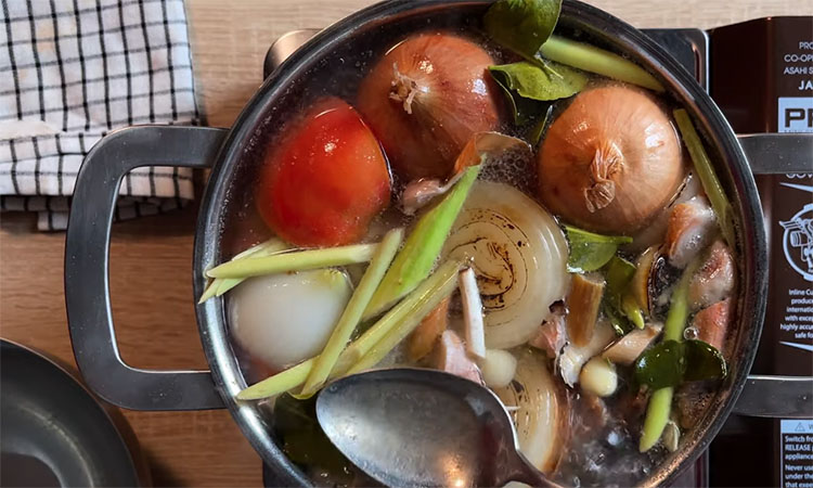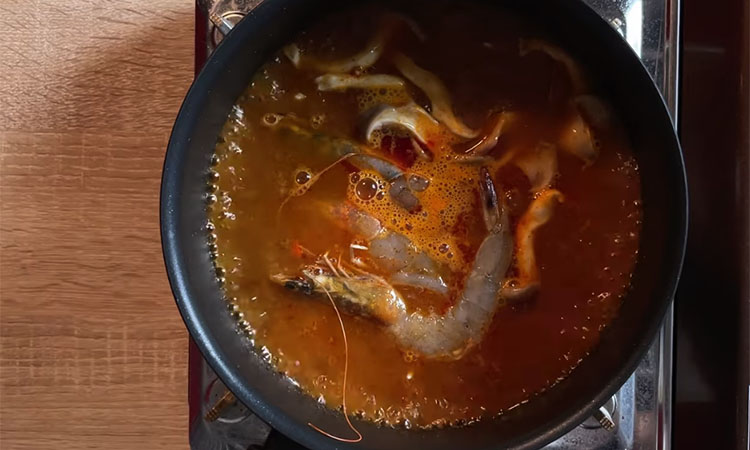Очистите сырые креветки, сохранив панцири и головы. Промойте их и положите в кастрюлю с двумя литрами воды, добавьте разрезанную на четыре части луковицу и нарезанный кружочками имбирь. Доведите до кипения, снимите пену и варите насыщенный бульон 10–12 минут на среднем огне, после чего процедите его в большую чистую кастрюлю. Доведите процеженный бульон до кипения и добавьте в него пасту Том Ям, тщательно размешивая её до растворения.