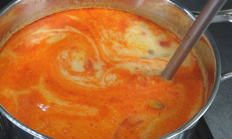Влейте в горячий, но уже не кипящий суп кокосовое молоко, добавьте рыбный соус и сок лайма. Перемешайте всё до однородности, пробуя на вкус: при необходимости добавьте соль (через соус), кислоту (через сок) или пару ложек сахара для баланса. Промойте рис несколько раз, залейте его холодной водой (в пропорции 1:2), посолите и доведите до кипения под крышкой. Убавьте огонь до минимума и варите 12–15 минут, затем дайте постоять без огня еще 10 минут.