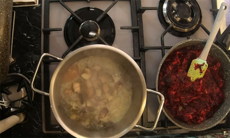 Заранее отварите говядину до мягкости, достаньте мясо из бульона и нарежьте его небольшими кусочками, а сам бульон процедите и снова доведите до кипения. На сковороде разогрейте топленое масло и обжарьте мелко нарезанный лук до золотистых краев, затем добавьте натертую морковь и пассеруйте их вместе еще несколько минут. Положите к овощам томатную пасту, слегка обжарьте ее для удаления лишней кислоты, после чего добавьте натертую отварную свеклу и перемешайте, чтобы овощи «поженились».
