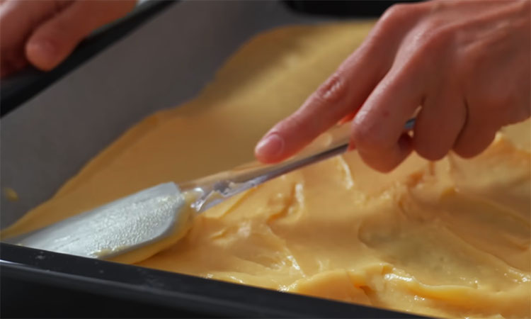 Переложите массу в глубокую миску, дайте ей немного остыть, чтобы яйца не свернулись, и начните вводить их по одному, тщательно вмешивая каждое до полного поглощения тестом. Готовое тесто должно быть эластичным и сползать с лопатки тяжелой лентой, образуя характерный «язычок». Распределите его ровным слоем по противню с пергаментом и выпекайте в разогретой до ста девяноста градусов духовке около тридцати-тридцати пяти минут до золотистого цвета.