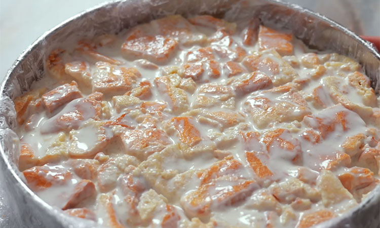 Остывшую заготовку нарежьте на небольшие квадратики. Для крема просто соедините сметану со сгущенным молоком и ванильным сахаром, перемешав венчиком до однородного состояния. Погрузите все кусочки выпечки в крем, аккуратно перемешайте и выложите в форму, застеленную пищевой пленкой, плотно утрамбовывая массу.