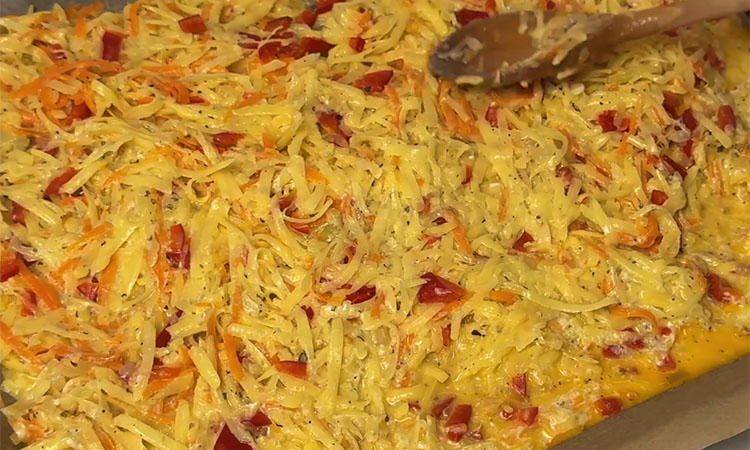 Снова всё хорошо перемешайте до получения однородного «теста». Противень застелите пергаментом (лайфхак: смочите противень водой, чтобы бумага не сворачивалась) и распределите овощную смесь ровным слоем. Отправьте в разогретую до 180°C духовку на 40 минут.