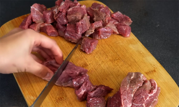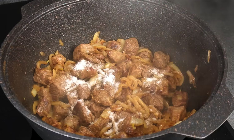 Начните с подготовки мяса: нарежьте говядину средними кубиками. Лук нарежьте полукольцами. В кастрюле с толстым дном разогрейте растительное масло, выложите мясо и обжаривайте его на сильном огне 5–7 минут до золотистого цвета, пока не испарится лишняя влага. Добавьте к мясу лук и жарьте всё вместе еще пару минут, пока лук не станет мягким.