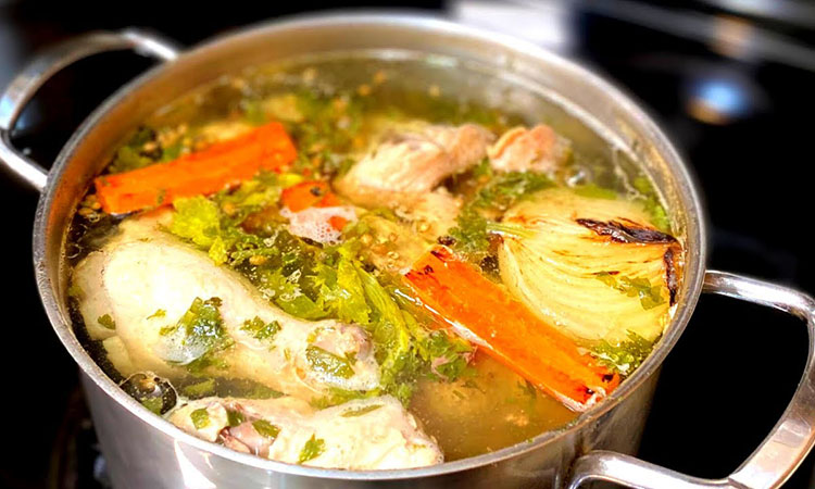 Убавьте огонь до минимума, чтобы жидкость лишь слегка подергивалась, и постоянно снимайте образующуюся пену в течение первых 50 минут варки. Добавьте в кастрюлю очищенную морковь, стебли сельдерея и целые луковицы спустя почти час после начала томления. Варите бульон еще 15-20 минут, после чего положите лавровый лист и горошины черного перца.