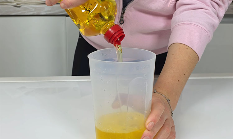 Для приготовления домашнего майонеза в узкую чашу блендера влейте растительное масло, добавьте соль, сахар, лимонный сок и горчицу, а затем аккуратно вбейте яйца, сохраняя целостность желтков. Прижмите желтки куполом погружного блендера к самому дну и взбивайте на максимальной мощности около 15 секунд, не поднимая насадку, а когда масса начнет густеть, плавно перемещайте блендер вверх-вниз до получения плотной эмульсии.