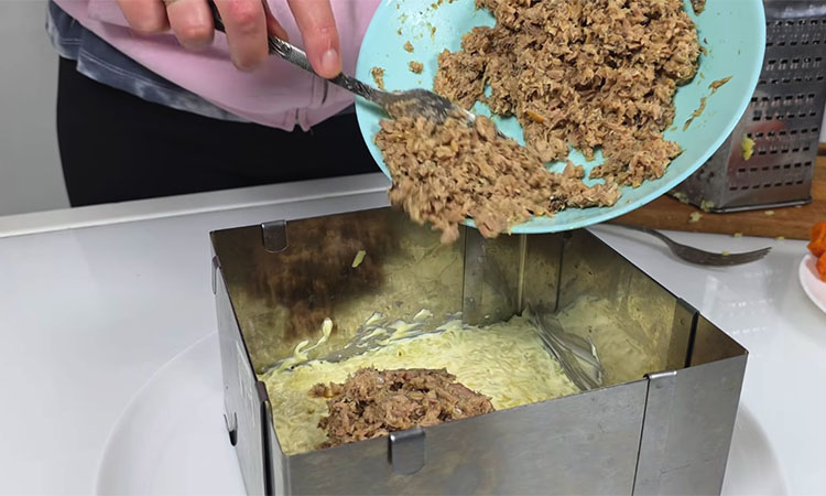 Для маринада мелко нарубите лук кубиками, залейте его смесью воды и уксуса с добавлением соли и сахара, оставьте на 15 минут, после чего максимально тщательно отожмите жидкость руками. Рыбную основу приготовьте, смешав в отдельной тарелке размятые вилкой сардины и тунец, предварительно слив лишнее масло и сок, чтобы салат не стал слишком жидким. Сборку начинайте с картофельного слоя: натрите отварной картофель на мелкой терке прямо в форму, слегка присолите и нанесите частую майонезную сетку.