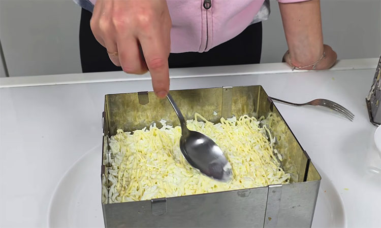 Предпоследним слоем натрите яичные белки, слегка посолите и нанесите финальную майонезную сетку. Завершите сборку, равномерно распределив через сито или мелкую терку яичные желтки по всей поверхности, не накрывая их соусом для сохранения воздушности. Готовый салат обязательно накройте пленкой в контакт и уберите в холодильник на 4-12 часов для полной стабилизации и пропитки всех слоев.