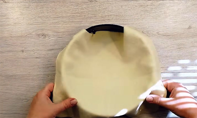 Перелейте готовую массу в форму на подготовленное тесто, разровняйте поверхность и при необходимости подрежьте края теста, чтобы пирог выглядел аккуратно.