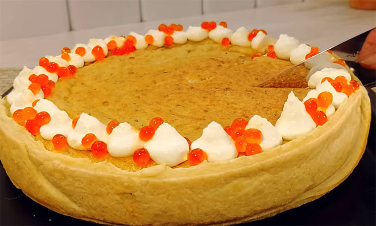Перед подачей украсьте пирог творожным сыром, икрой или маринованными огурчиками, которые идеально подчеркивают вкус рыбы.