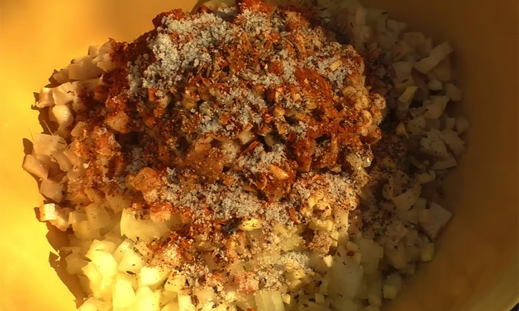 Нарежьте лук мелким кубиком, стараясь делать кусочки максимально однородными. Сало также нарежьте очень мелким кубиком и соедините с луком в глубокой емкости. Добавьте измельченный чеснок, черный перец, приправу для мяса и разотрите в ладонях зиру для раскрытия аромата. Посолите массу и тщательно перемешайте все ингредиенты до добавления яиц. Вбейте в смесь четыре яйца и перемешайте до получения влажной, однородной консистенции.