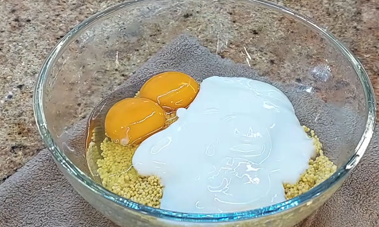 Тщательно промойте пшено, обдайте его кипятком пару раз, затем залейте горячей водой и оставьте набухать на всю ночь. Утром максимально тщательно слейте всю воду с подготовленной крупы. Разогрейте духовку до 180 градусов. Добавьте к пшену два яйца, кефир и растительное масло.