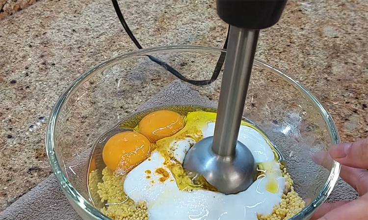 Приправьте массу солью, сушеным чесноком, куркумой и черным перцем для улучшения усвоения специй и придания золотистого цвета. Измельчите все ингредиенты погружным блендером до максимально однородного состояния.