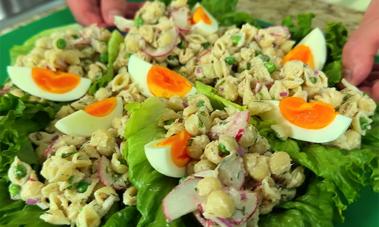 Новый весенний салат поражает своей гармоничностью: сытность макарон и рыбы здесь идеально уравновешена хрустящим редисом, сладким зеленым горошком и свежестью укропа. Использование консервированной горбуши или тунца делает блюдо богатым белком и полезными жирами, а подача на листьях салата добавляет эстетики и пользы. Это отличный пример того, как из простых продуктов, которые всегда есть под рукой, можно создать сбалансированное и вкусное сезонное блюдо.