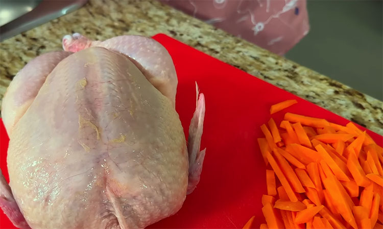 Нарежьте морковь соломкой, а лук (предварительно охлажденный для удобства нарезки) — кубиком. Обжарьте лук на сковороде с высокими бортиками до золотистого цвета, затем временно уберите его со сковороды. На этой же сковороде в смеси растительного и сливочного масел начните обжаривать морковь. Приправьте части курицы солью и перцем.