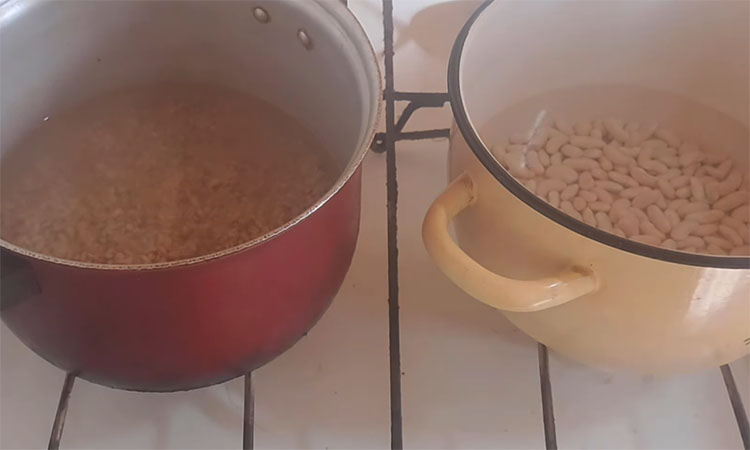 Начните подготовку с вечера: залейте стакан перловки тремя стаканами воды. То же самое проделайте с фасолью в отдельной емкости. Утром слейте воду, промойте их и поставьте вариться в разных кастрюлях. В перловку добавьте лавровый лист для солидности. Варите крупу 30–40 минут, а фасоль — до полной мягкости. Разогрейте жаровню с небольшим количеством растительного масла.