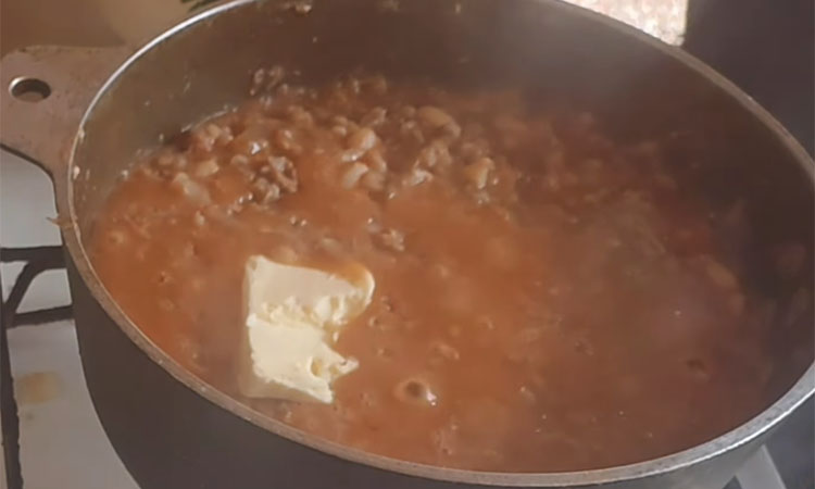 Обжарьте мелко нарезанный лук в течение 3–5 минут до мягкости. Выложите в жаровню всю банку тушенки вместе с жиром и соком, разбейте крупные куски мяса и дайте им «подружиться» с луком. Добавьте в жаровню готовую перловку, чтобы она пропиталась мясным ароматом, и следом закиньте отваренную фасоль. Тщательно перемешайте. Для правильной кислинки и сочности добавьте томатную пасту и немного воды, чтобы ничего не пригорело.