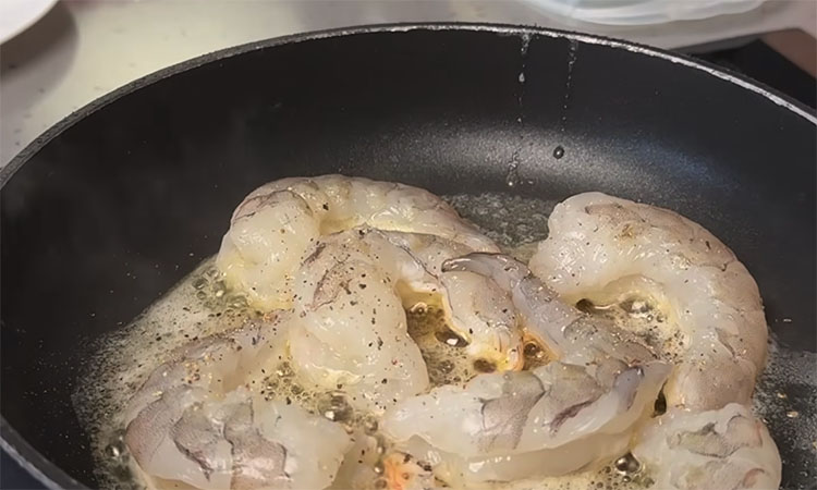 Крабовые палочки лучше использовать сочные, сорта «Снежный краб» — их не нужно резать, просто порвите их руками на длинные тонкие волокна прямо в миску. На сковороде растопите кусочек сливочного масла и обжарьте на нем очищенные креветки буквально по минуте с каждой стороны на среднем огне, в процессе слегка поперчив.