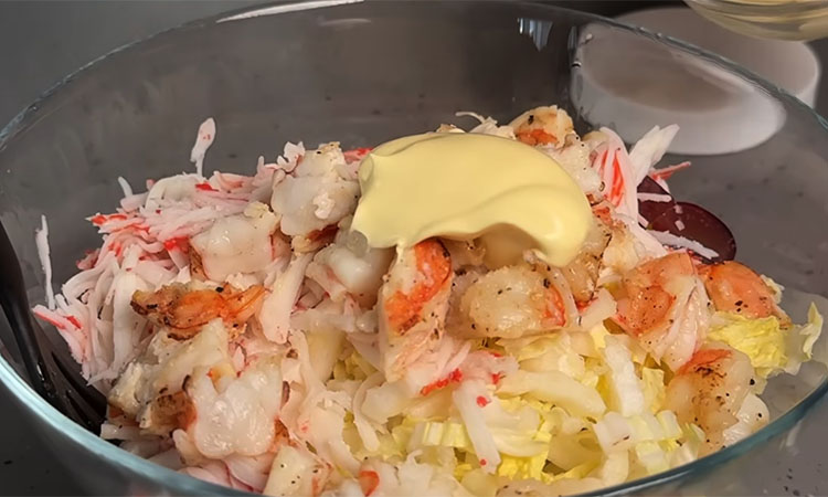 Готовым креветкам дайте немного остыть, после чего разрежьте каждую на четыре части и переложите в салатник к остальным продуктам. Добавьте соль по вкусу, заправьте всё майонезом и тщательно перемешайте до однородности.