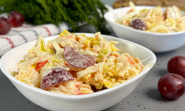 Салат «Графиня» не зря у многих хозяек считается фаворитом. Он получается очень сочным, свежим и улетает со стола одним из первых. Как правило, гостей интересует крайне необычное сочетание ингредиентов: кроме крабовых палочек в этот салат идет виноград, который на удивление хорошо сюда подходит.