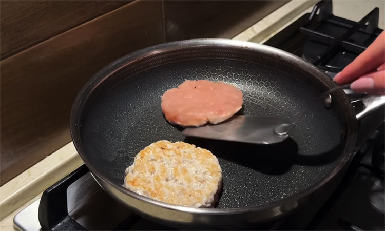 Начните с основы для лепешек: натрите одну крупную морковь весом 150 г и 60 г сыра на терке, добавьте яйцо, соль и хорошо перемешайте. Противень застелите пергаментом, выложите массу четырьмя равными кучками и сформируйте лопаткой плоские круги, после чего запекайте в духовке при 180 градусах 25 минут. Куриное филе измельчите в блендере или мясорубке, посолите, поперчите и сформируйте две плоские котлеты.