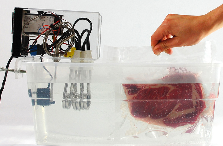 Для полноценного использования метода сувид вам понадобится собственно сам продукт, стерильный вакуумный пакет, установка для откачки воздуха и герметичного запечатывания пакета. Специальный прибор для готовки сувида необходим, но вполне можно попробовать приготовить пробные партии в мультиварке с точной регулировкой температуры. Но тут ситуация осложняется тем, что без термометра тут не обойтись и нужно будет постоянно проводить замеры температуры. Перевести приготовление sous-vide в автономным режим поможет прибор, который называется так же как и метод — сувид. Он оснащен специальной камерой для приготовления, которая абсолютно герметична и имеет систему поддержания температуры на нужном уровне. -