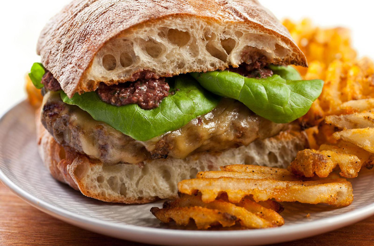5. Нижнюю булочку промажьте тапенадой, положите на нее котлету, салат и томаты (в случае использования), и добавьте еще одну ложку тапенады. Завершите бургер, накрыв его второй булочкой, и подавайте. -