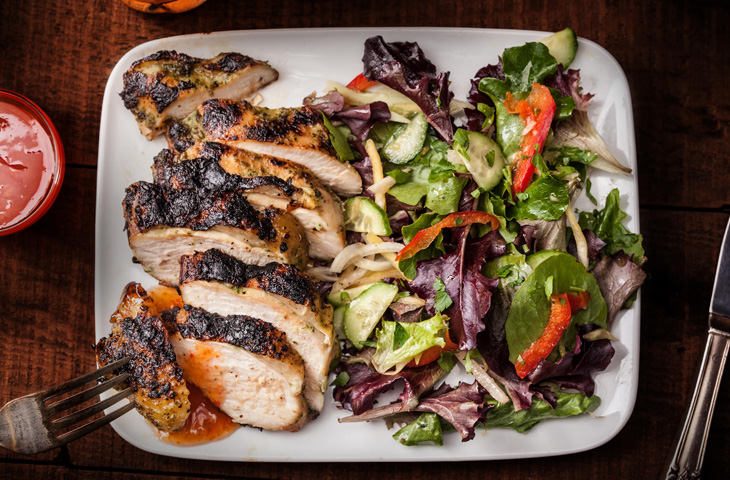4. Разогрейте сковороду гриль на средней температуре и сбрызните ее маслом. Жарьте куриные грудки по 5 минут с каждой стороны. Для переворота на другую сторону желательно использовать щипцы. После жарки дайте грудкам отдохнуть 10 минут на теплой тарелке;