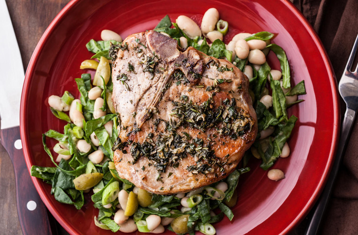 6. Тем временем разложите по тарелкам салат с белой фасолью. Затем положите отбивные на тарелки, сбрызните уксусной заправкой и подавайте на стол. -