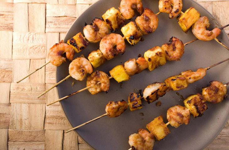 3. Плотно насаживайте на шампур креветки и ананасы по очереди. Креветки протыкайте в области хвоста и тушки. В результате на шампуре должно получиться три креветки и два кусочка ананаса. Смажьте получившийся шашлык глазурью с одной стороны;