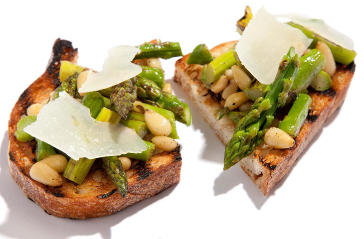 4. Перед подачей выложите хлеб и спаржу на тарелке, чередуя слои, и положите сверху сыр. -