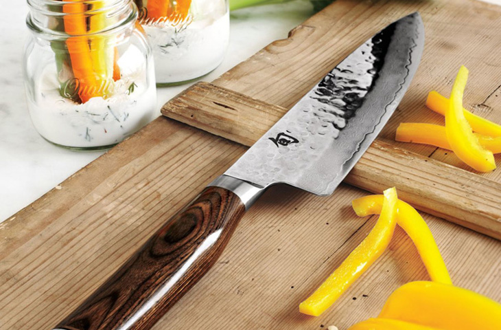 Если вы когда-нибудь бывали в специализированных барах, где еду готовят прямо перед вами, то наверняка видели такой. Ну, или хотя бы замечали сверкающее на сверхзвуковых скоростях лезвие. Клинок Shun Premier изготовлен из дамасской стали, доработанной вручную для придания нужной текстуры. Кроме декоративной функции, она имеет и практическую роль: не дает остаткам продуктов прилипнуть к лезвию. Угол заточки в 16 градусов делает Shun Premier острым, как бритва. Цена около 165$.