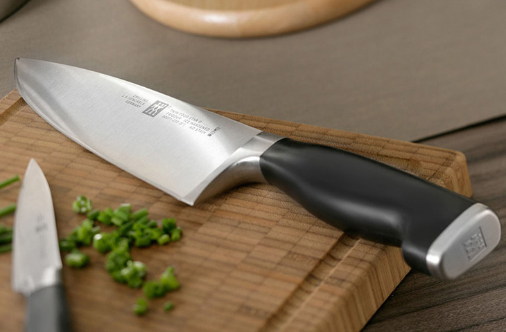Однозначный выбор хорошего, но ленивого повара. Лезвие Henckels сохраняет остроту бесконечно, поскольку выполнено из монолитного отрезка нержавеющей стали, закаленной особым образом. Полипропиленовая рукоять удобна до неприличия: ладонь не чувствует ни излишней мягкости, ни давления. Общий дизайн тесака рассчитан на взыскательного пользователя, привыкшего не только к удобству, но и к изяществу предмета. Стоит всего около 100$.